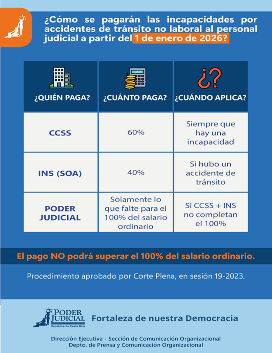 Romero Jenkins detalló que, “…a partir del 1 de enero de 2026 la persona servidora judicial que se le otorgue una incapacidad temporal de accidente de tránsito no laboral, deberá gestionar ante los entes aseguradores el pago del subsidio por dichas incapacidades, como es la Caja Costarricense de Seguro Social (C.C.S.S) y el Instituto Nacional de Seguros (INS)”.